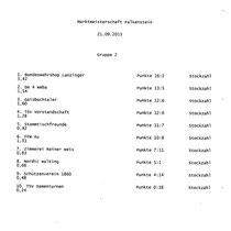 Am 21.09.2013 fand die 10.Marktmeisterschaft der Falkensteiner Stockschützen statt. Begrüßt werden konnten 18 Mannschaften. Gespielt wurde in zwei Gruppen, und die beiden ersten aus jeder Gruppe mussten zum Endspiel um den Wanderpokal im Anschluß antreten. Der Wanderpokal ging an den Titelverteidiger vom Vorjahr - dem Bundeswehrshop Lanzinger. Herzlichen Glückwunsch!